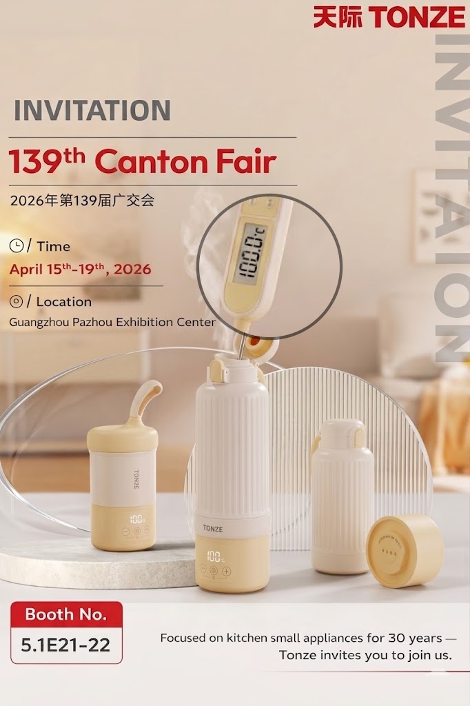 We are officially announcing that TONZE, a preeminent China-based manufacturer with 30 years of specialized expertise in R&D, design, and large-scale production of small home appliances and professional mother-baby care appliances, will participate in the 139th China Import and Export Fair (Canton Fair) Spring Session 2026, held at the Canton Fair Complex in Pazhou, Guangzhou. We cordially invite global distributors, brand partners, bulk purchasers, and industry stakeholders to visit our dedicated booth at 5.1E21-22.